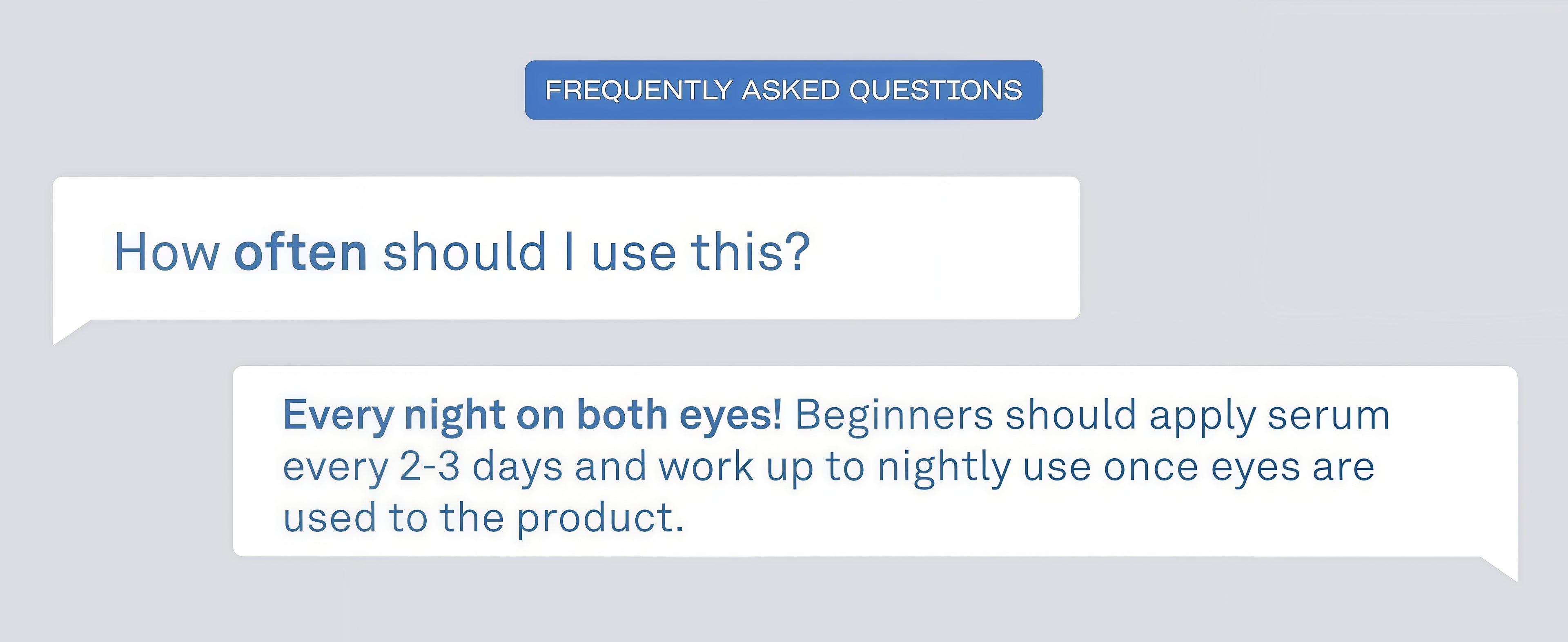 Every night on both eyes! Beginners should apply serum every 2-3 days and work up to nightly use once eyes are used to the product. Once satisfied with results, you can apply just 2-3 times a week to maintain your look.